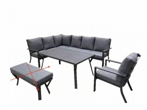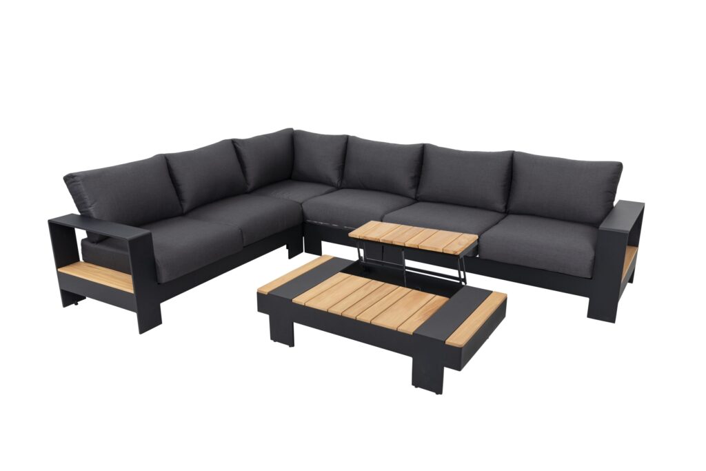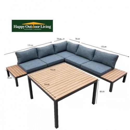 Aluminium frame, 16 cm armleuningen met teakhouten binnenkant van de armleuningen. Waterafstotende kussens in zitting en rugleuning, dikte 15cm. Set: 236x307x74 cm